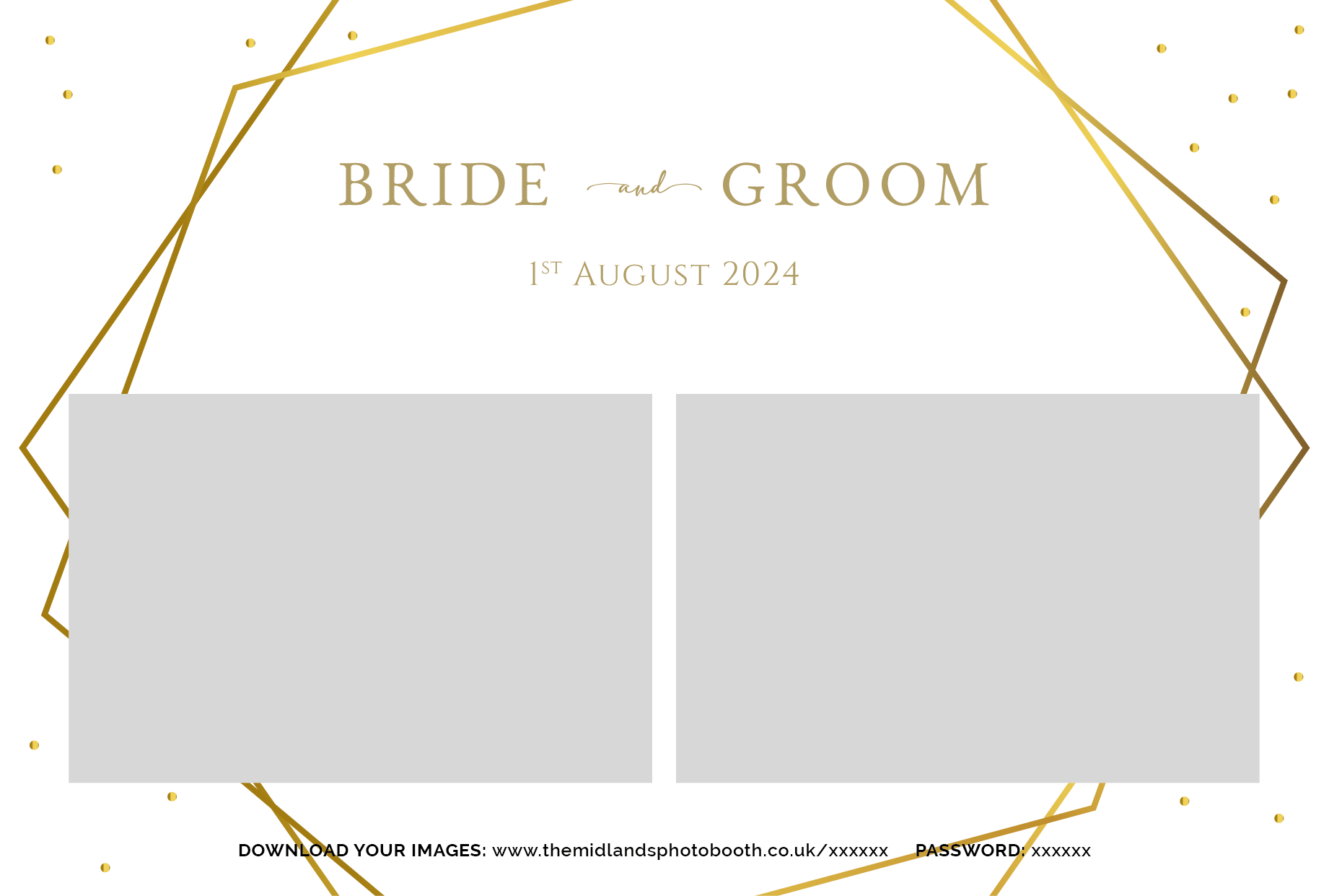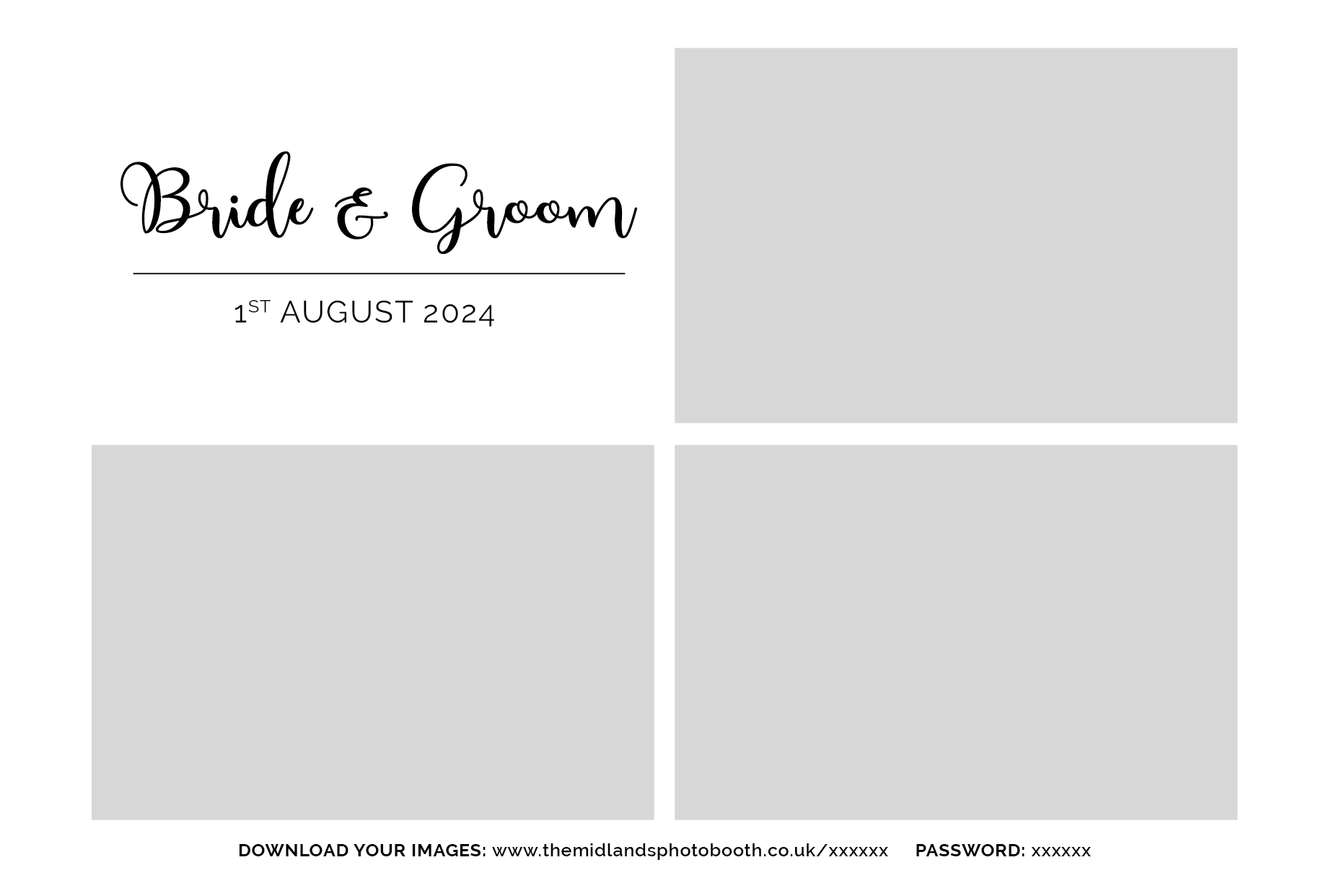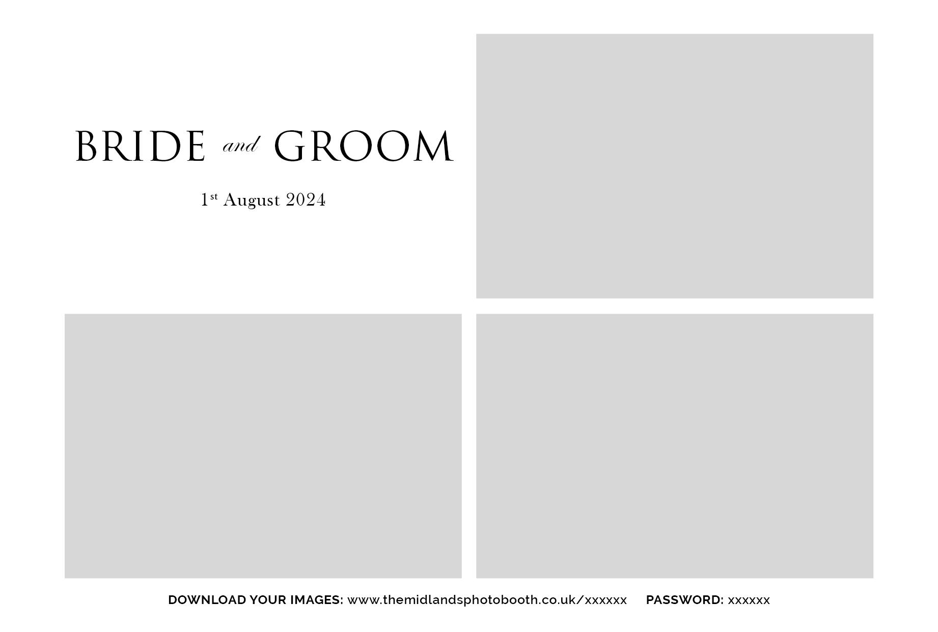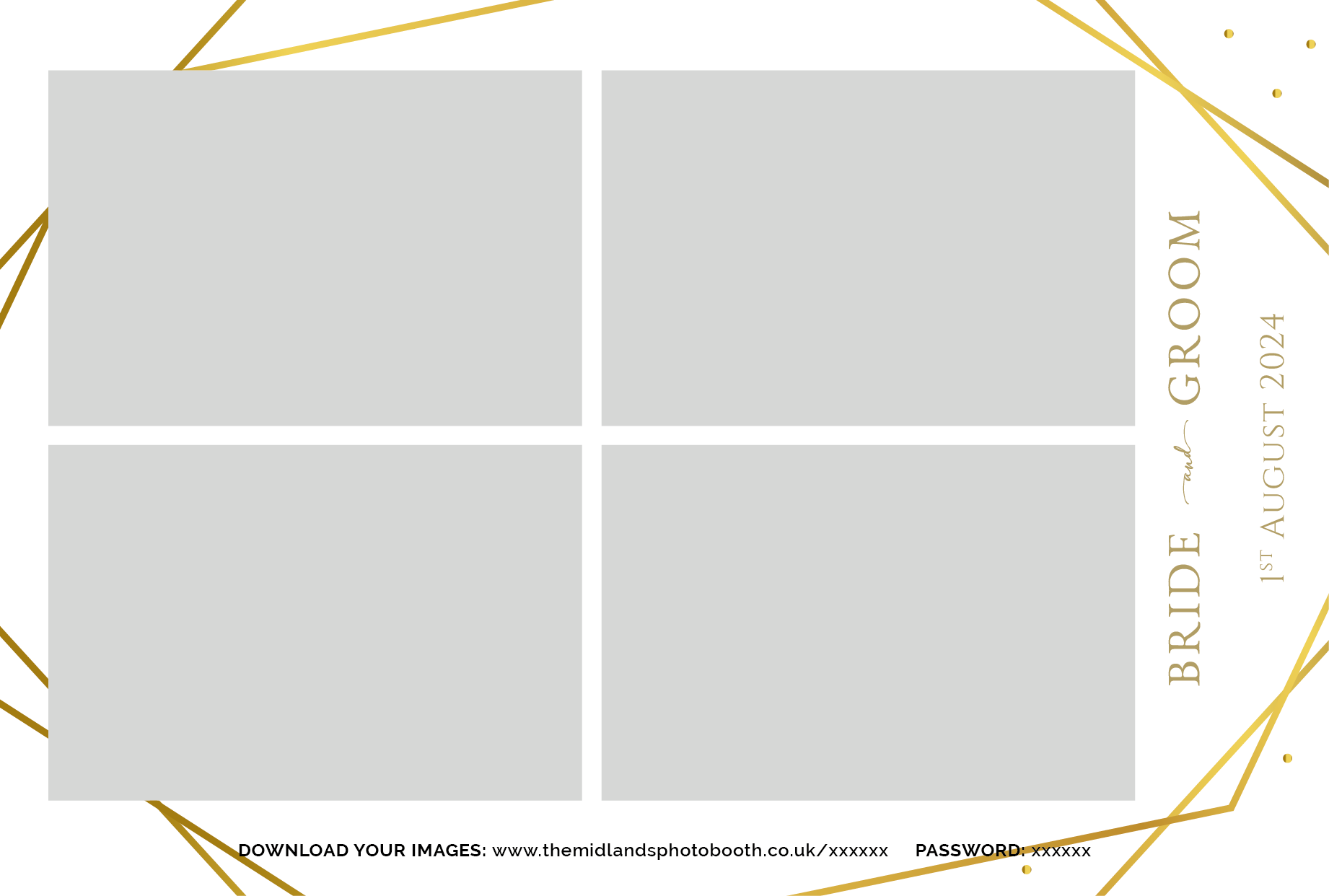 Below are our pre-designed templates. If you’ve opted for a Silver Package, you can choose any of these templates and it will be customised with your names and date. Each template pack contains 4 different templates to allow guests to choose between 1 and 4 photos each time they use the booth.
